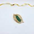 Deze vintage Trifari broche is een krachtig en elegant statementstuk, uitgevoerd in goudkleurig metaal en rijk bezet met diep smaragdgroene rhinestones. Het dynamische, waaiervormige ontwerp geeft de broche beweging en diepte, terwijl de intense groene stenen zorgen voor een luxueuze, tijdloze uitstraling.