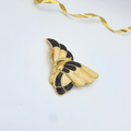 Deze vintage Trifari broche is uitgevoerd als een elegante vlinder, opgebouwd uit zacht afgeronde vleugelvormen in zwart en crèmekleurig emaille, omlijst door een goudkleurige contour. De subtiele marmering in het emaille geeft diepte en beweging, terwijl de symmetrische vorm zorgt voor een krachtige, grafische uitstraling.